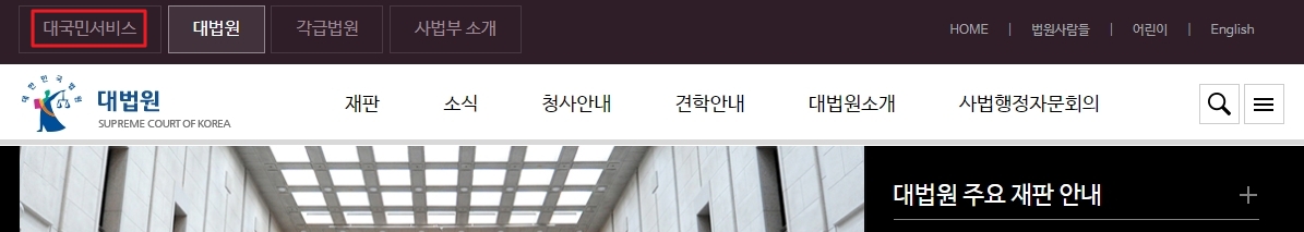 대법원 홈페이지는 처음 들어가면 메뉴가 많아서 조금 어렵게 느껴질 수 있습니다. 하지만 걱정하지 마시고 화면의 왼쪽 윗부분을 자세히 살펴보세요. 그러면 '대국민서비스'라는 글자를 찾을 수 있을 거예요. 이름 그대로 우리 같은 일반 국민들을 위해서 법원이 제공하는 여러 가지 편리한 정보들이 모여있는 곳이니, 여기를 눌러서 들어가면 우리가 찾는 사건검색 기능을 만날 수 있습니다.