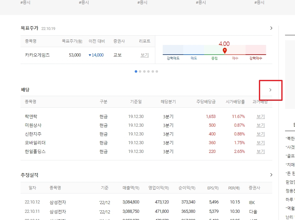 국내증시 화면으로 넘어오셨다면 이제 상세한 정보를 찾아볼 차례입니다. 화면을 아래쪽으로 조금만 내려보시면 왼쪽에 여러가지 메뉴들이 있는데 그중에서 배당이라고 적혀있는 글자 옆의 화살표를 눌러주시면 된답니다. 그러면 배당과 관련된 순위 정보를 확인할 수 있는 페이지로 이동하게 됩니다.