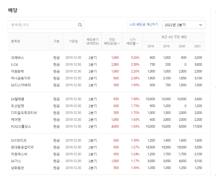 배당 페이지로 이동하면 이제 거의 다 왔습니다. 오른쪽 위를 보시면 기준이 되는 년도와 분기를 선택할 수 있는 부분이 있어요. 정확한 비교를 위해서는 1년 전체를 기준으로 확인하는 것이 좋지만, 여기서는 예시로 2022년 2분기를 선택해서 진행해보겠습니다.