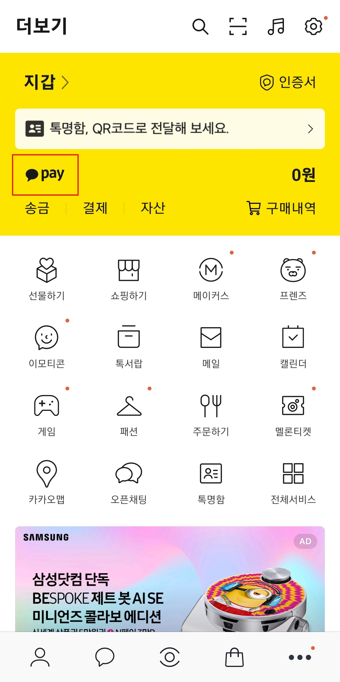 '더보기' 화면으로 들어가면 보통 위쪽에 내 프로필이 나오고 그 아래로 여러 가지 메뉴가 보이는데요. 여기서 노란색 배경의 'pay'라고 적힌 부분을 찾아서 눌러주면 카카오페이의 메인 화면으로 이동하게 됩니다. 아주 쉽죠?