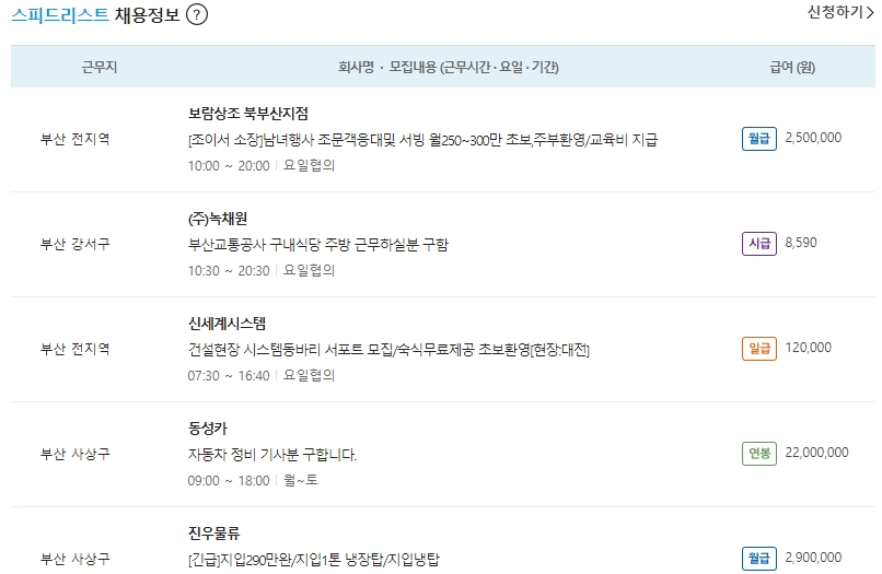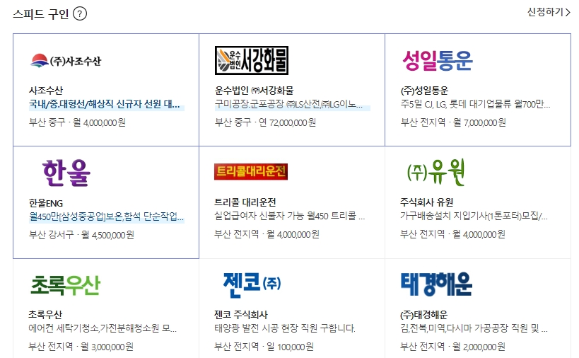 검색 결과에는 다양한 조건의 일자리들이 나타납니다. '스피드' 표시가 붙은 공고는 광고비를 더 지불한 업체이므로 상단에 노출됩니다. 월급을 살필 때는 현실적인 금액인지 꼼꼼히 따져보는 것이 좋습니다. 예를 들어, 운전직 월 600만 원과 같은 공고는 실제 근무 조건이나 강도가 매우 높을 수 있습니다.