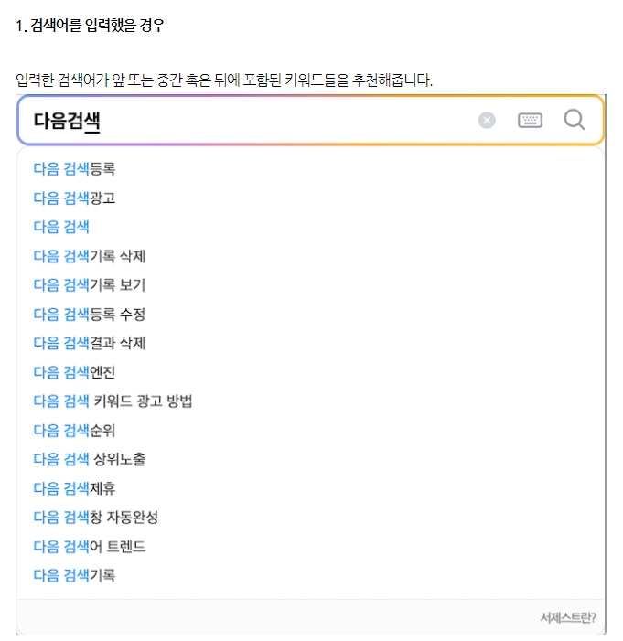 검색창 아래에 표시되는 단어들은 검색 기록이 아니라 '서제스트(Suggest)'라고 불리는 자동 완성 기능입니다. 이 기능은 현재 입력 중인 글자를 바탕으로 사람들이 많이 찾는 관련 검색어를 추천해 주는 역할을 합니다.