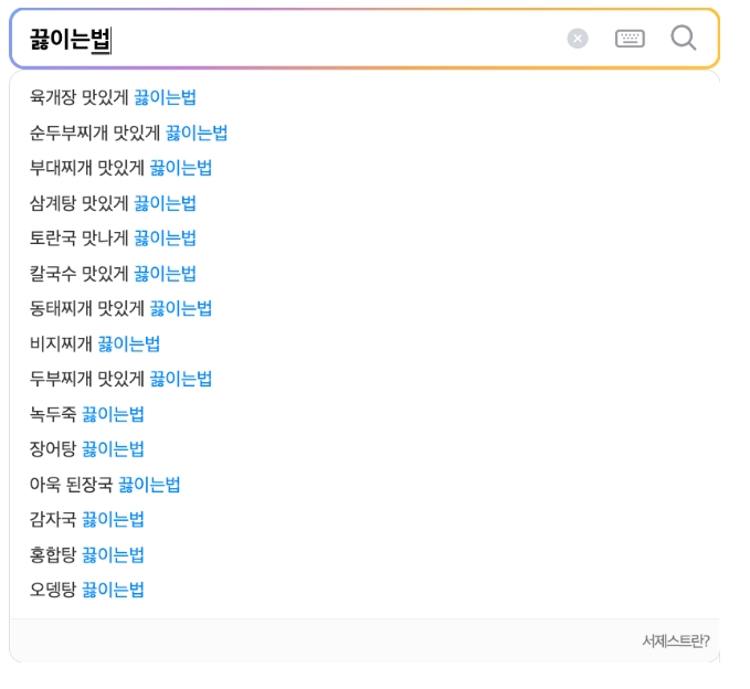 자동 완성 기능의 가장 큰 장점은 편리함입니다. 검색하려는 단어를 끝까지 입력하지 않아도 몇 글자만 치면 관련된 추천 검색어가 나타나 클릭 한 번으로 빠르고 정확하게 정보를 찾을 수 있습니다.