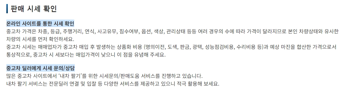 중고차 매매 항목으로 들어가면 '판매가이드'를 찾을 수 있습니다. 여기서는 차를 팔기 전에 꼭 확인해야 할 점들을 순서대로 알려줍니다. 예를 들어, 내 차의 정확한 상태를 파악하는 방법이나 시세를 알아보는 요령 등이 포함되어 있습니다.