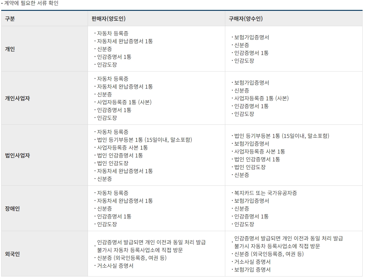 구매자(사는 사람)의 경우 신분증이 필요하며, 만약 명의 이전을 직접 하지 않고 대리인을 통한다면 인감증명서와 인감도장이 필요할 수 있습니다. 또한, 차량을 운행하기 위해 미리 가입한 가입증명서도 필수입니다.