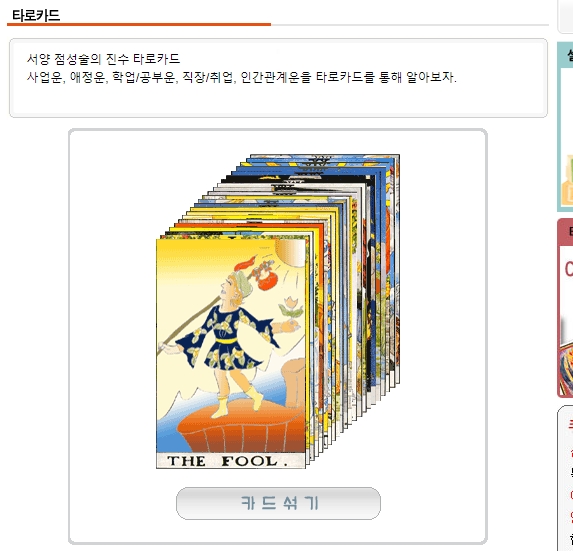 왼쪽 메뉴를 보면 '타로카드'라고 바로 보일 거예요. 이것저것 다른 운세도 많지만, 저희는 오늘 타로를 볼 거니까 저걸 눌러서 다음으로 넘어가면 된답니다.