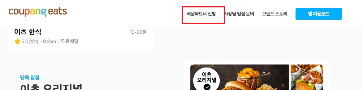 다시 화면 위쪽을 보니까 '배달 파트너'라는 메뉴도 있더라고요. 이건 쿠팡이츠 배달 알바(라이더) 지원하는 곳이에요. 요즘엔 '쿠팡이츠 배달 파트너' 앱도 따로 있어서 많이들 하시더라고요.