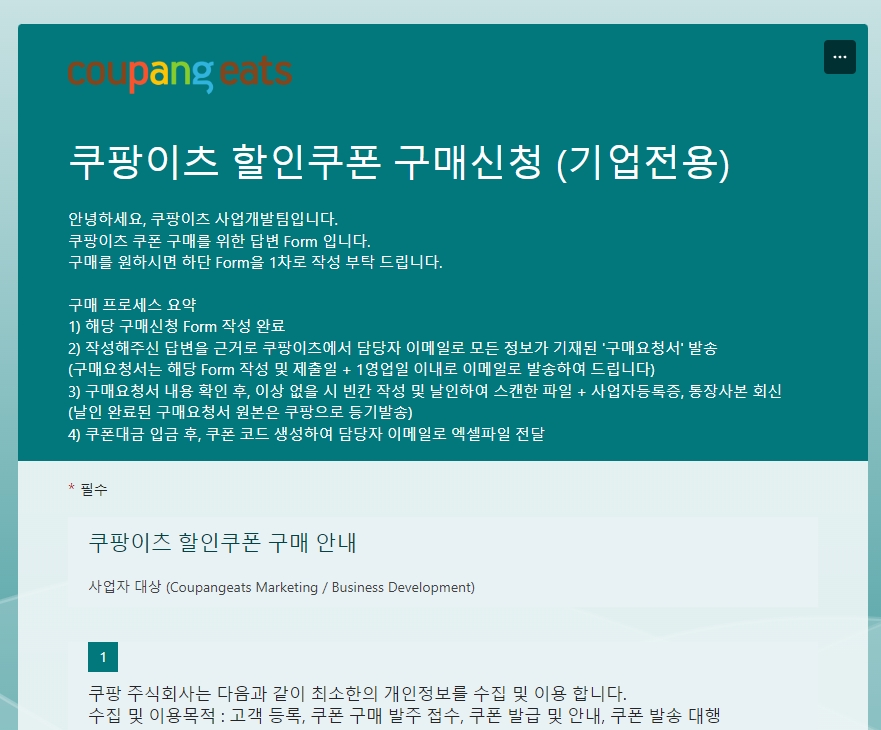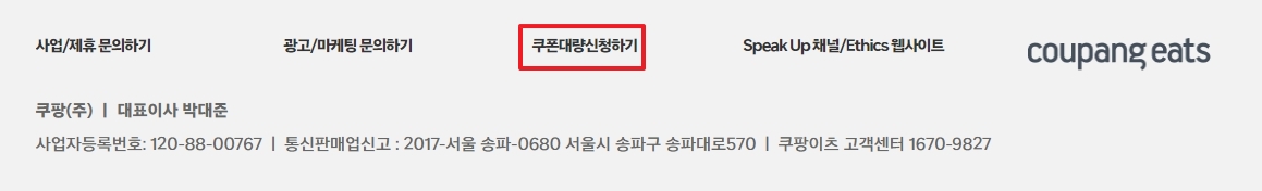 아까 그 '쿠폰 대량 신청'이 이런 건가 봐요. 가끔 회사에서 이벤트로 'OO기업 제휴' 이런 식으로 쿠팡이츠 할인쿠폰 뿌릴 때 있잖아요. 그런 B2B용 신청 메뉴인 것 같더라고요.