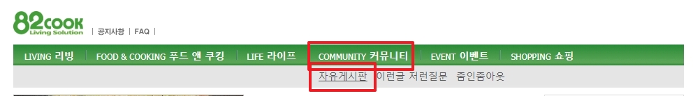 1. 82쿡 홈페이지에 접속하면 메인 화면에서 다양한 메뉴를 볼 수 있습니다. 주요 메뉴로는 82쿡, 키친토크, 라이프, 자유게시판, 리빙데코 등이 있습니다. 각각의 메뉴는 음식, 생활 정보, 커뮤니티 소통 등을 위한 카테고리로 구성되어 있습니다.
